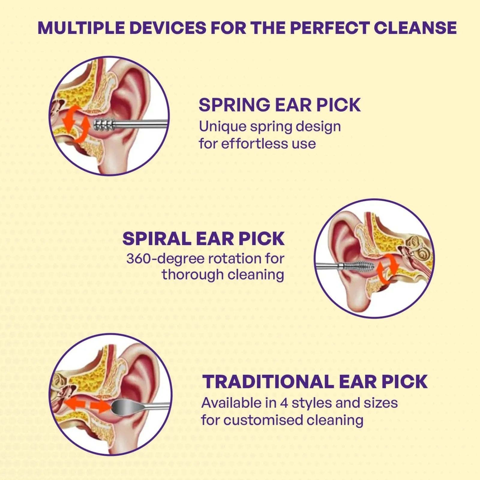 - ERGONOMIC DESIGN: Fully polished tools with a smooth and rounded surface, all to prevent any irritation or scratching, and make sure you can massage the ear canal and relieve itching while cleaning. The handles of the ear pick tools are designed for a non-slip grip.